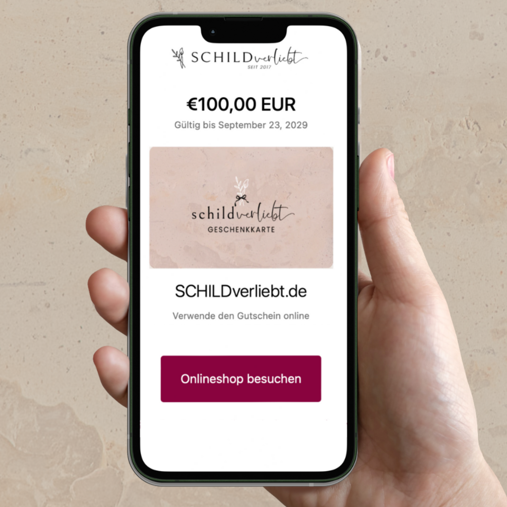 Mit unserem SCHILDverliebt Online-Gutschein liegst du immer richtig – besonders, wenn die Beschenkten gerade ihre Hochzeit planen. Der Gutschein kommt direkt per E-Mail zu dir und kann sofort verschenkt werden – ideal auch als Last-Minute-Geschenk.