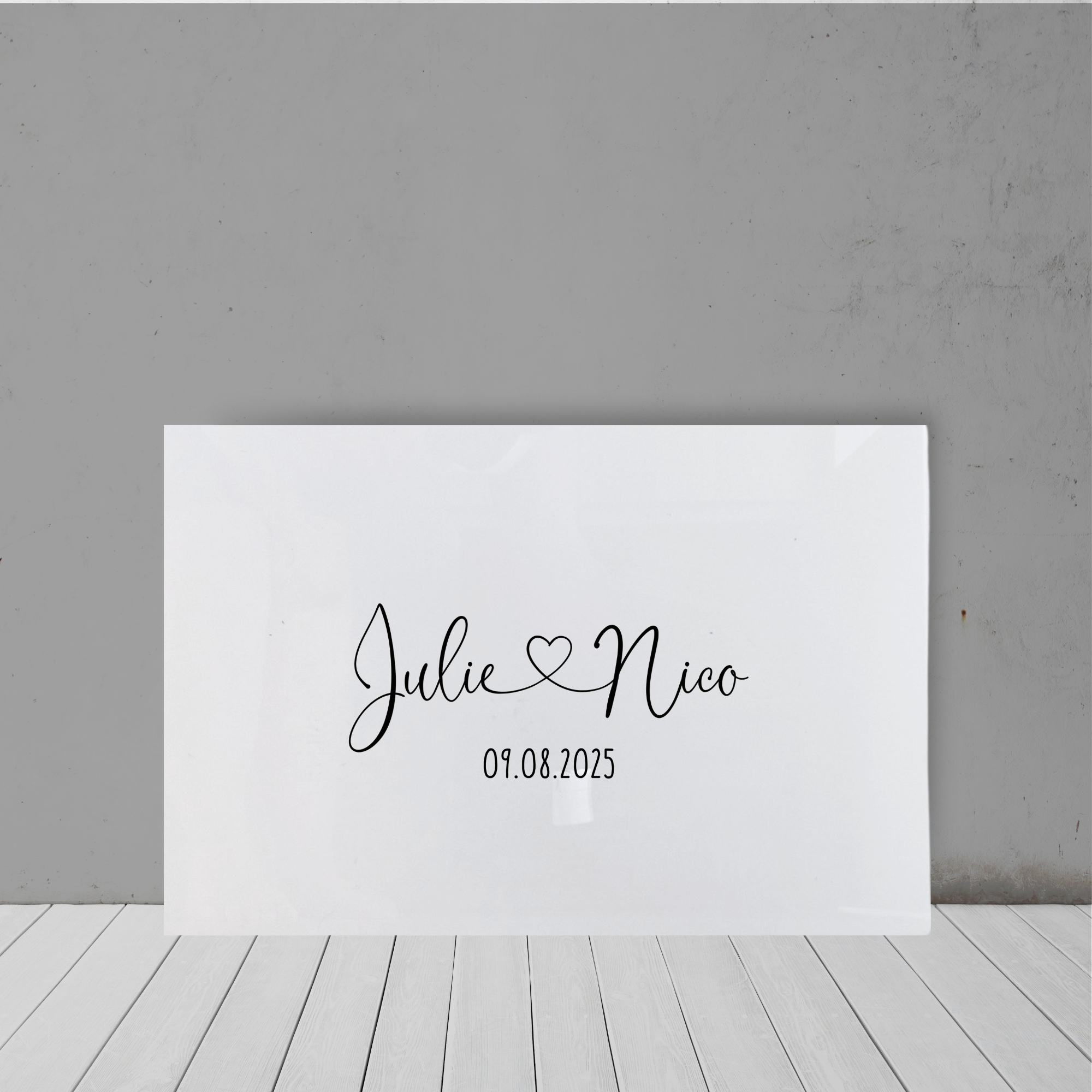 Ein stilvolles Gästebuch-Schild aus hochwertigem Acryl – die moderne Alternative zum klassischen Gästebuch. Platziert es auf eurer Feier und lasst eure Gäste liebevolle Nachrichten und Unterschriften hinterlassen. Eine wunderschöne Erinnerung, die ihr euch auch nach dem großen Tag dekorativ in eurem Zuhause aufstellen könnt.