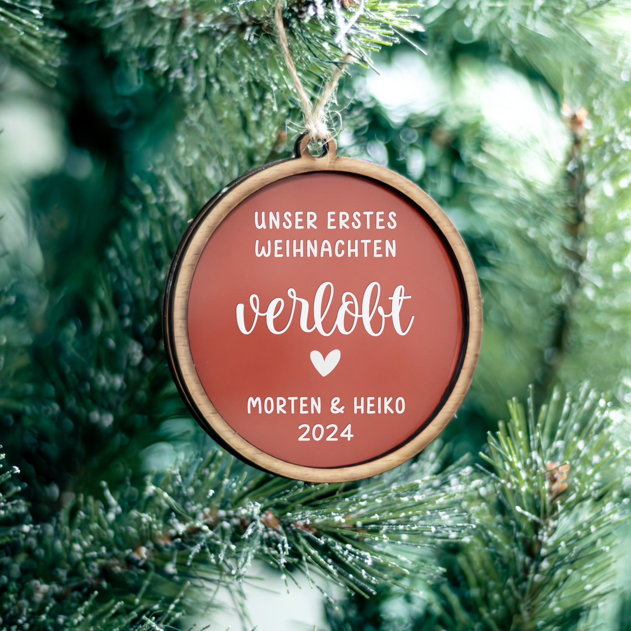 Das Weihnachtsfest als Verlobte ist ein Moment voller Zauber – und dieses Ornament macht ihn sichtbar. Aus Buchenholz, Acrylglas und hochwertiger Vinylfolie gefertigt, wird der runde Anhänger (Ø 8 cm) mit euren beiden Namen und einem Datum personalisiert. So entsteht ein Schmuckstück, das Erinnerungen bewahrt und euren Weihnachtsbaum jedes Jahr bereichert.