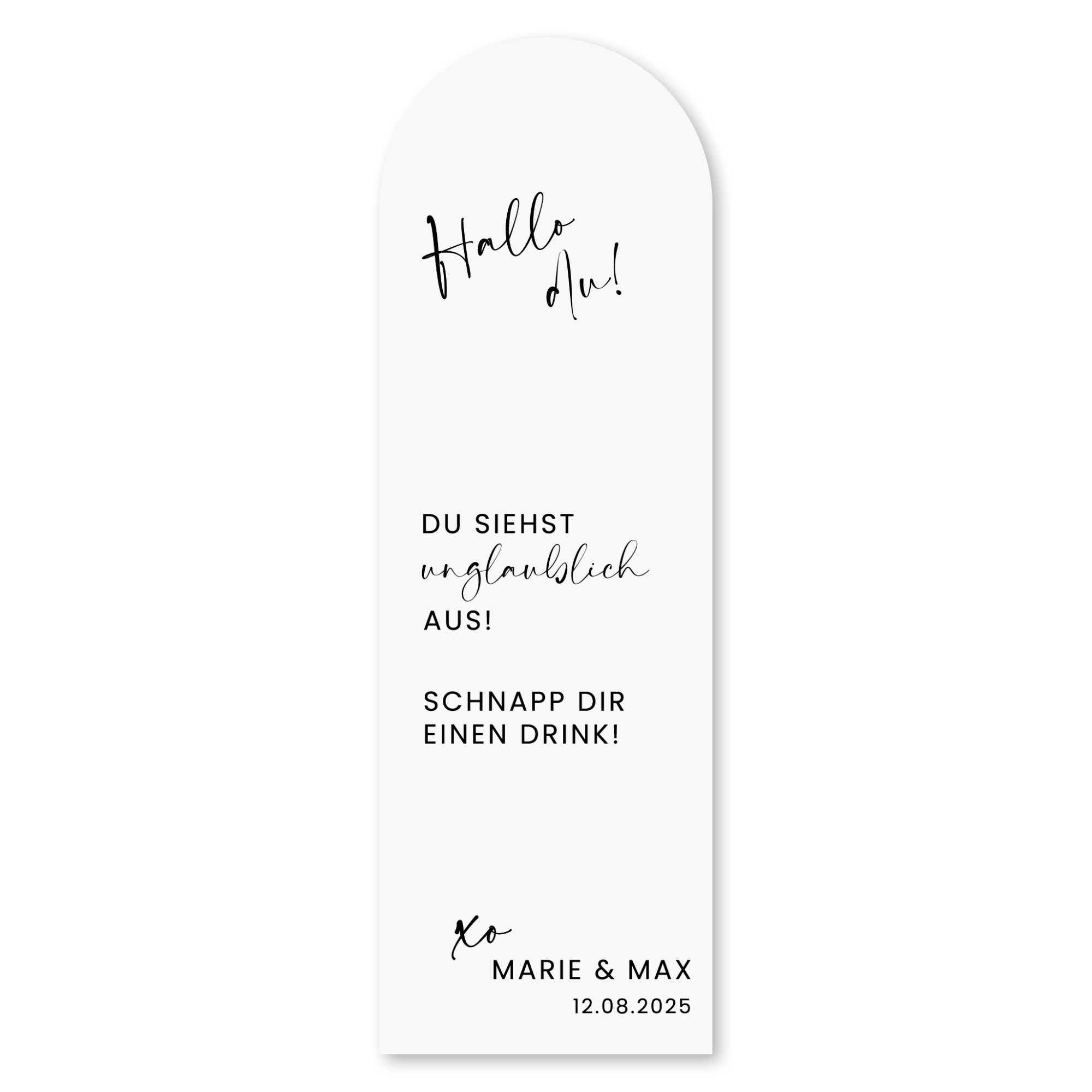 Alle Texte können angepasst werden - schließlich ist es dein besonderer Tag! Unsere generischen Formulierungen werden durch deine persönlichen / individuellen Texte ersetzt. Für ein vollständig individuelles Design oder falls dein Wunschtext länger ist als unser generischer Text, kontaktiere uns bitte vor der Bestellung.