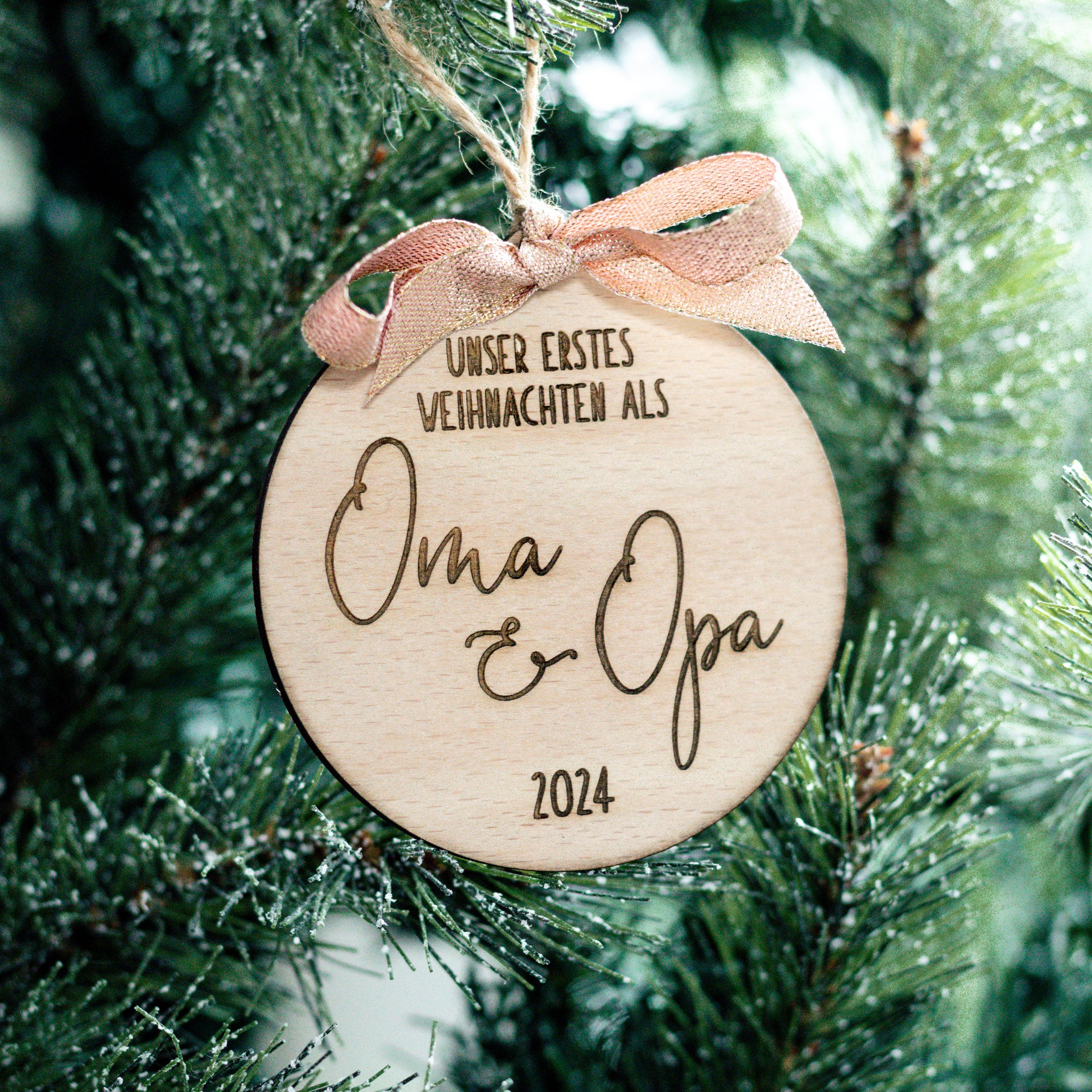 Der Anhänger „Unser erstes Weihnachten als“ besteht aus hochwertigem Buchen-Sperrholz und misst 8 x 9 x 0,4 cm. Das edle Design ist sorgfältig gelasert und trägt den Schriftzug „Unser erstes Weihnachten als“ mit einer romantischen Schnörkelschrift für „Oma & Opa“, oder "Mama & Papa", oder eine unserer anderen Texte die du wählen kannst. Die Jahreszahl 2024 ist ebenfalls eingraviert, um diesen besonderen Moment zu verewigen. Standardmäßig kommt der Anhänger mit einem rustikalen Jute-Band zum Aufhängen, aber du kannst ihn auch mit einer dekorativen Schleife in deiner Lieblingsfarbe verzieren lassen. Dieser handgefertigte Anhänger ist ein wunderbares kleines Weihnachtsgeschenk für frischgebackene Großeltern – eine besondere Erinnerung an das erste Weihnachten mit dem neuen Familienmitglied.