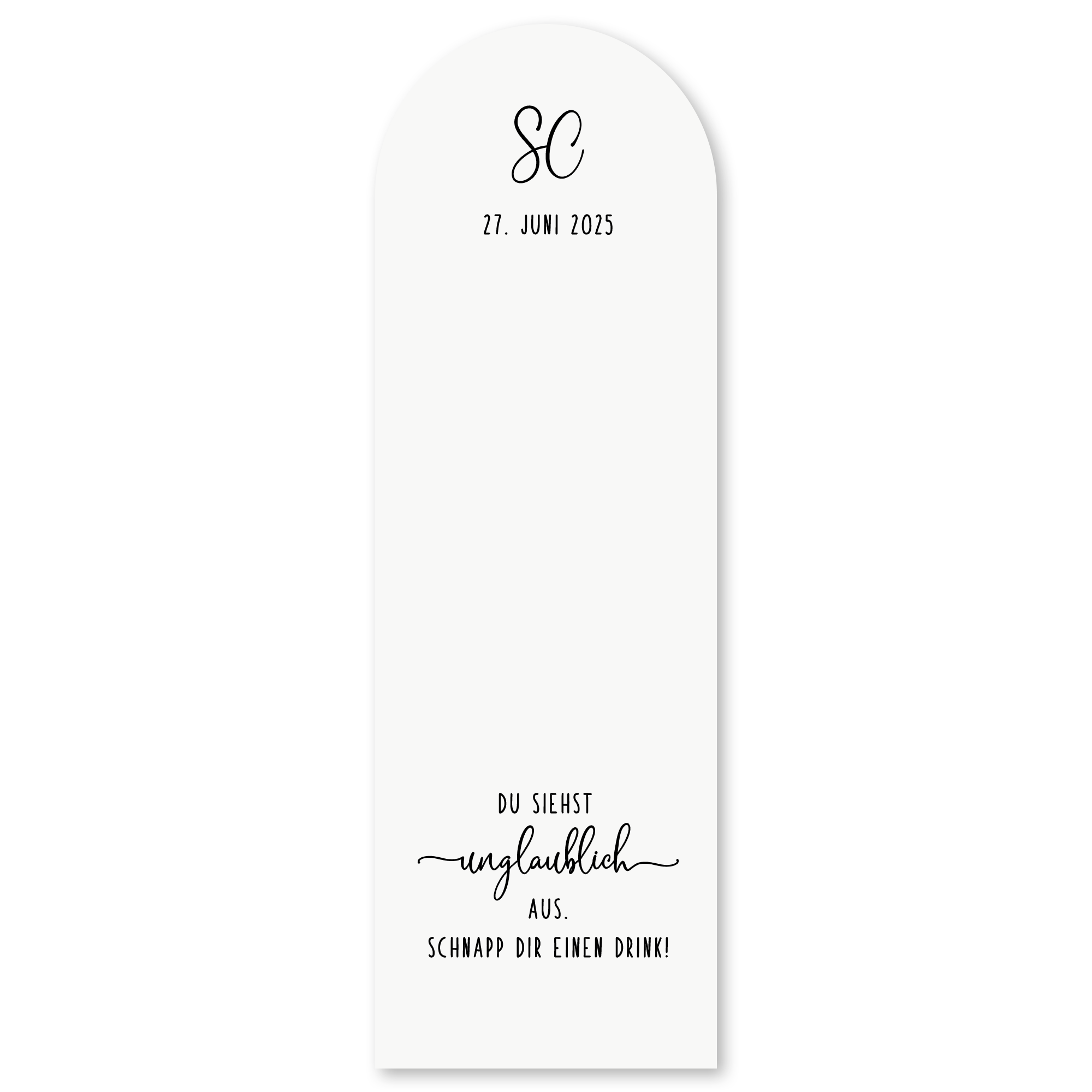 Wählt einfach die gewünschte Breite und Folienfarbe – wir fertigen euren Aufkleber mit euren Initialen und eurem Hochzeitsdatum genau nach dem gezeigten Designprinzip. Die einzelnen Zeilen lassen sich in der Höhe flexibel auf eurem Spiegel anordnen, sodass alles perfekt passt.