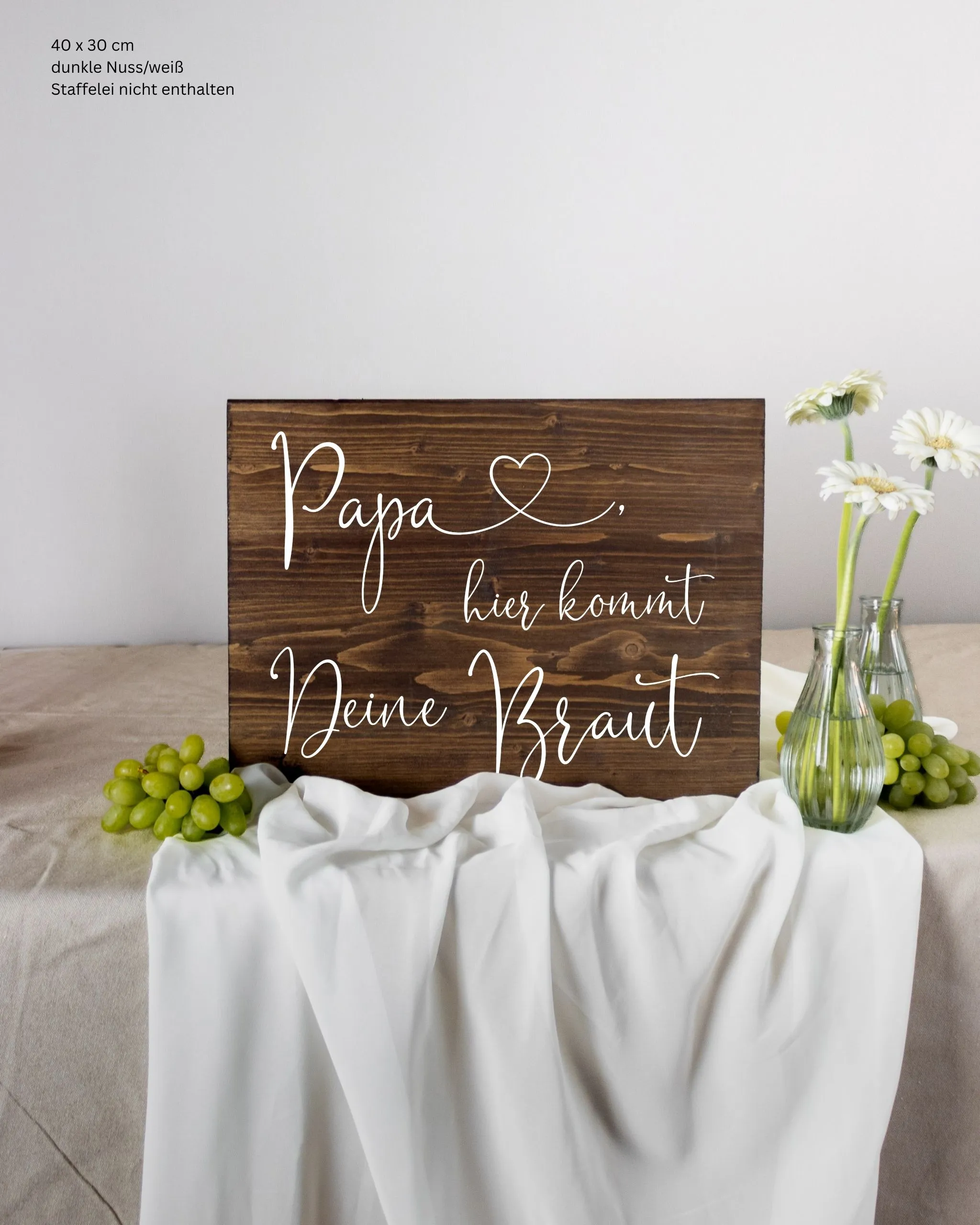 Das „Hier kommt die Braut“-Schild ist ein beliebter Klassiker für euren Einzug – handgefertigt aus Leimholz, leicht und perfekt für kleine Hände.