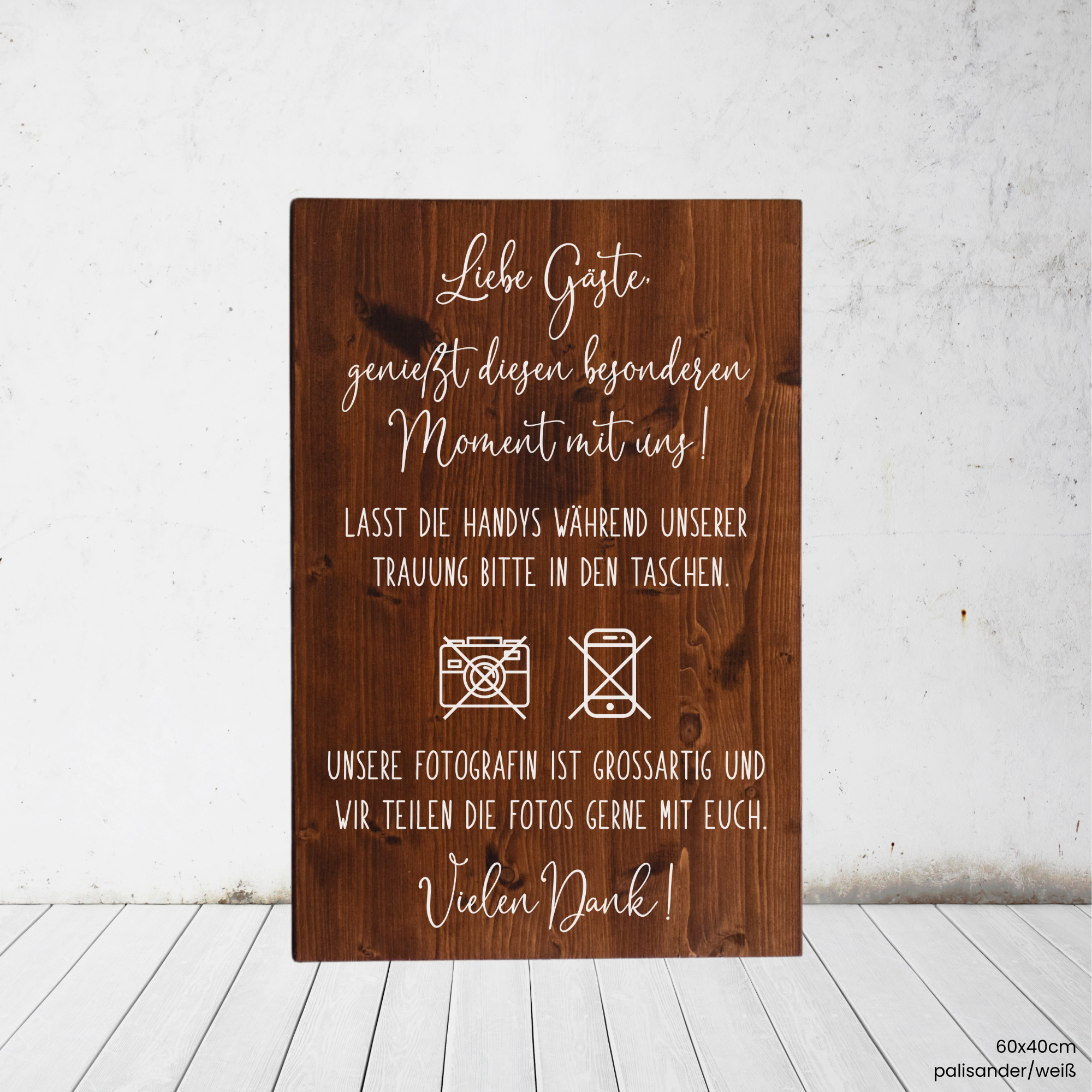 Ihr wählt einfach eure Lieblingslasur, Schriftfarbe und die passende Textvariante – ob unsere Fotografin, unser Fotograf oder unsere Fotografen – und wir fertigen euer Schild genau nach dem gezeigten Designprinzip.