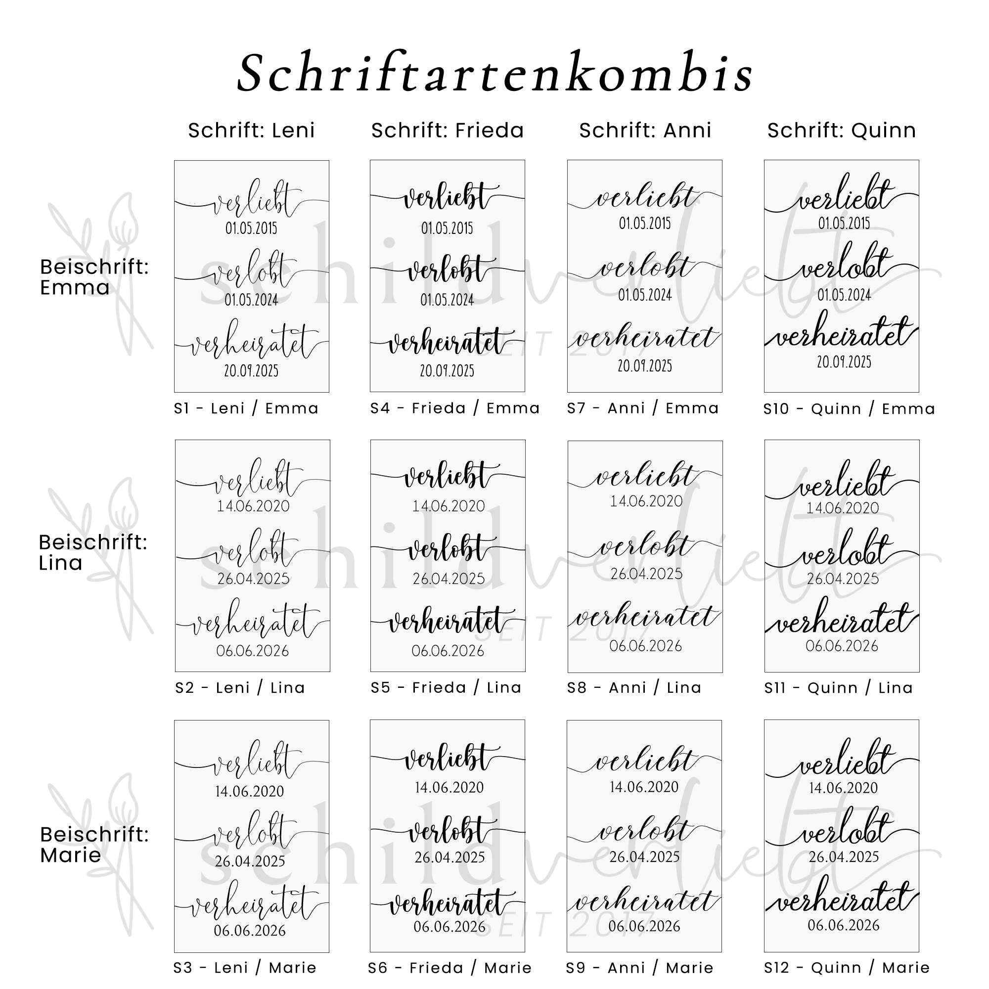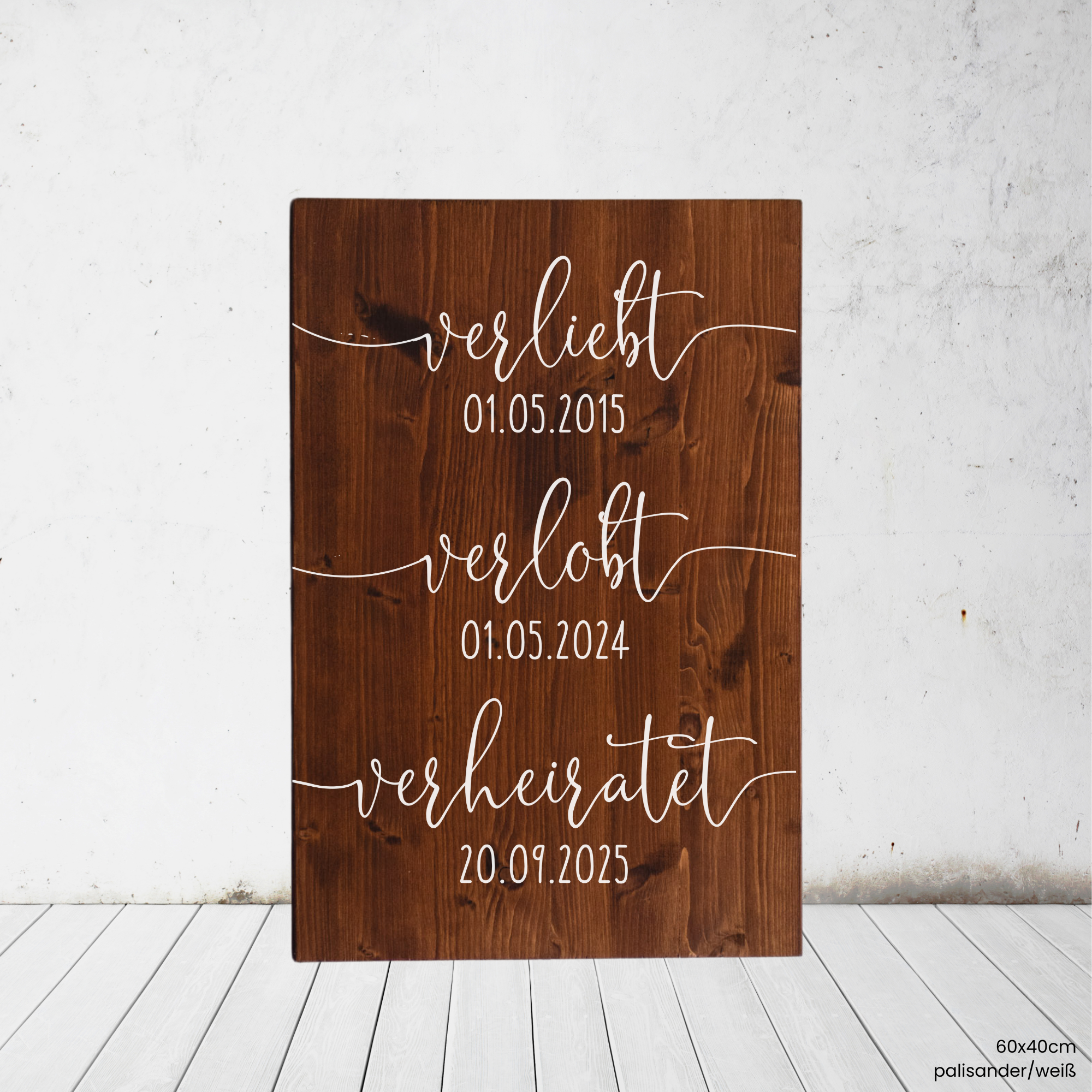 Wir personalisieren euer Schild mit den Daten eurer Pärchen-Meilensteine und fertigen es exakt nach dem gezeigten Designprinzip.